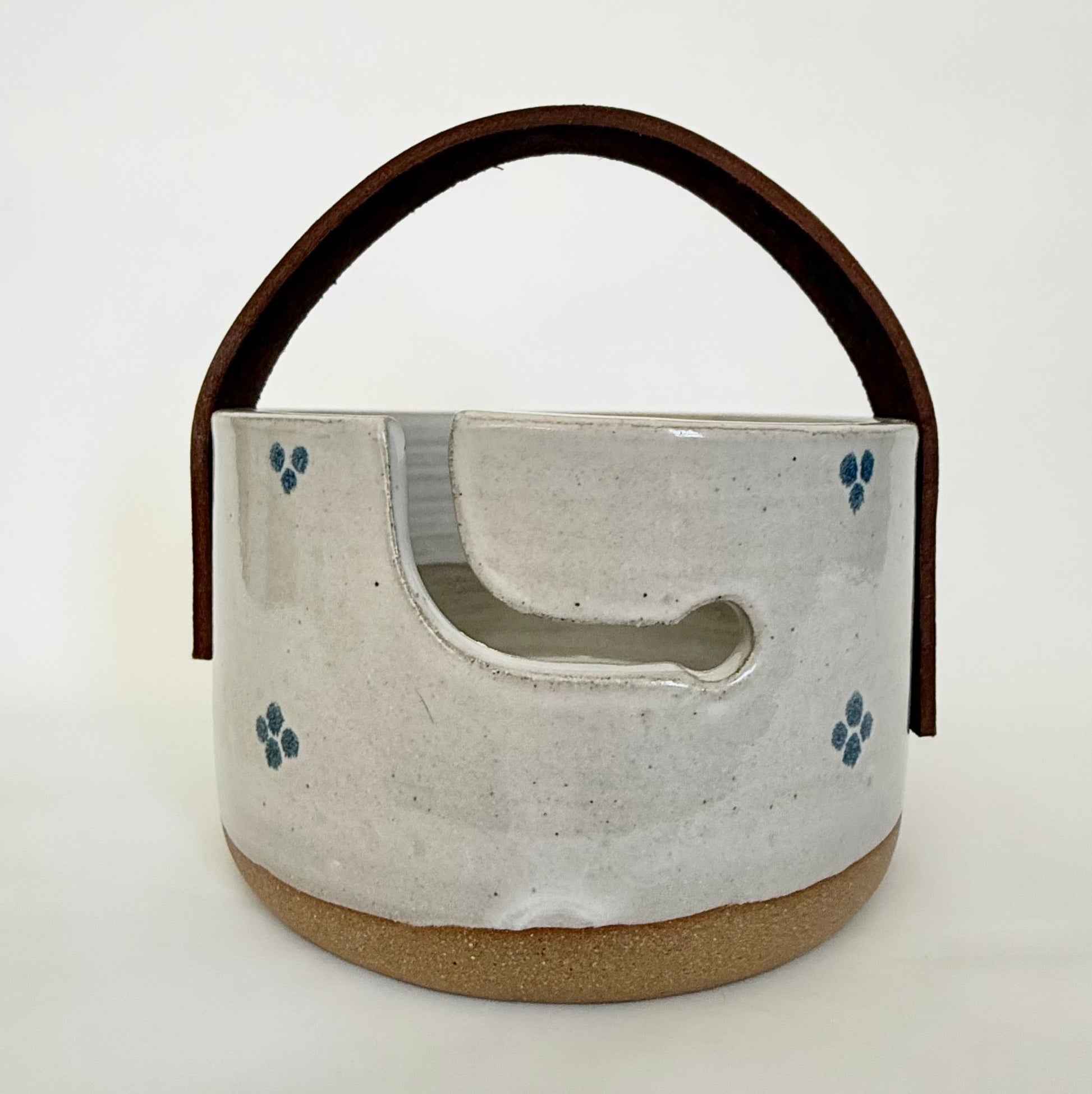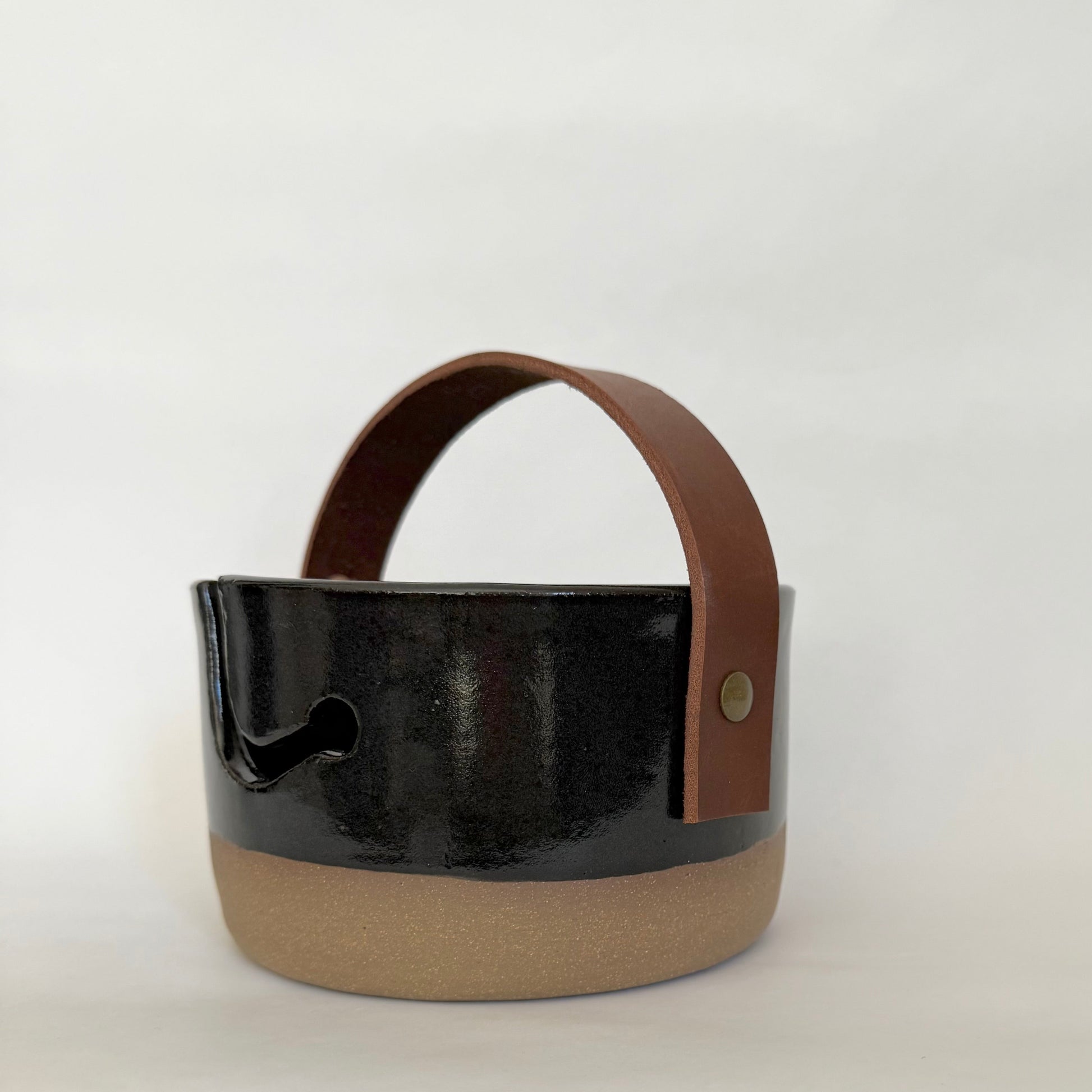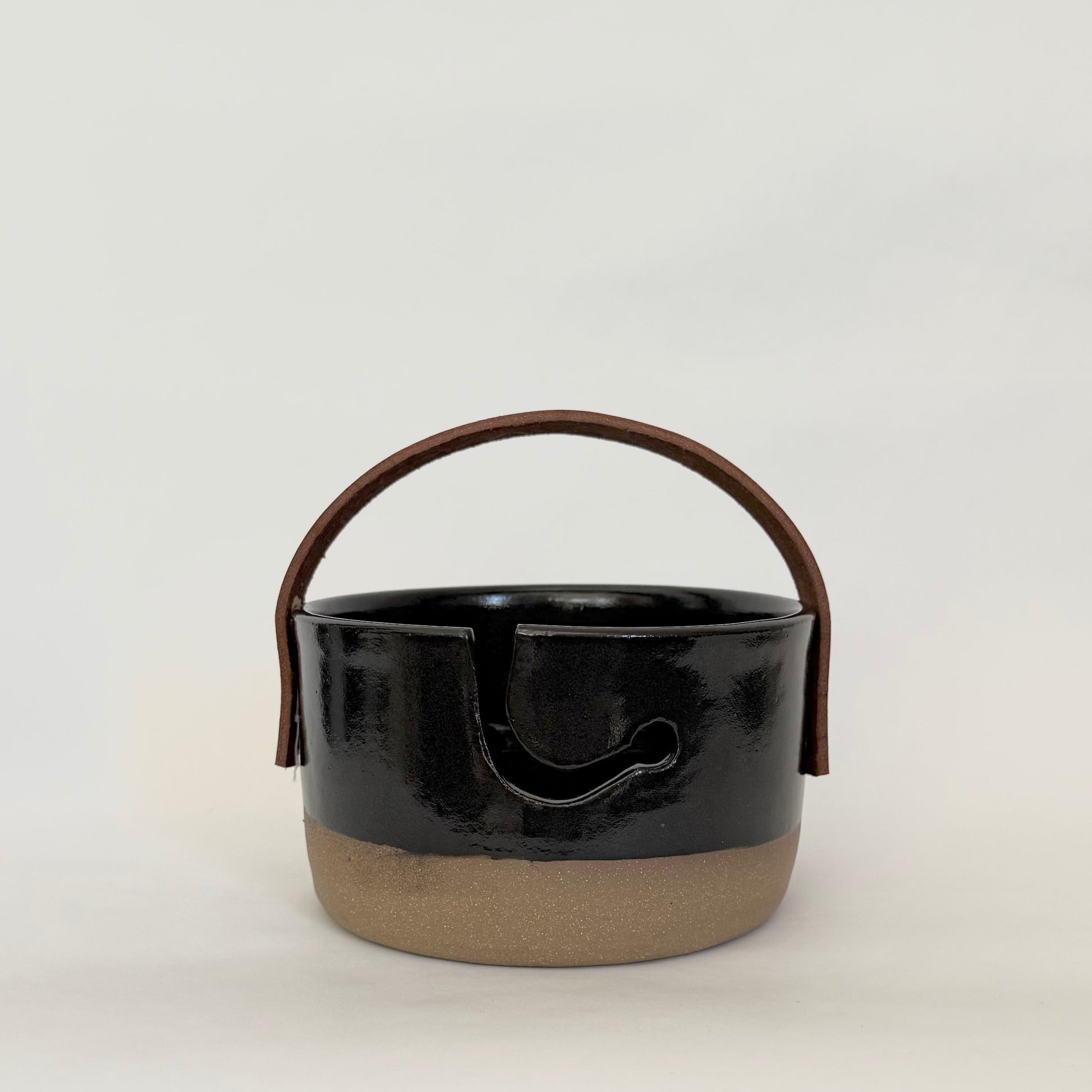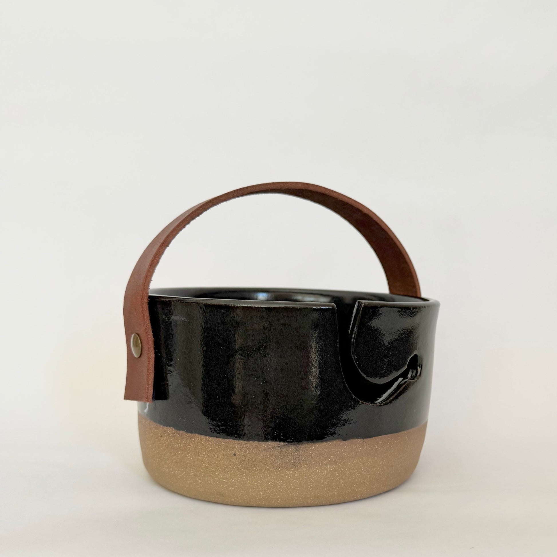 Wheel thrown in brown stoneware, with a glazed interior and exterior. Featuring a custom leather handle and a hand carved opening for ease of pulling yarn. The perfect companion for all your knitting projects.